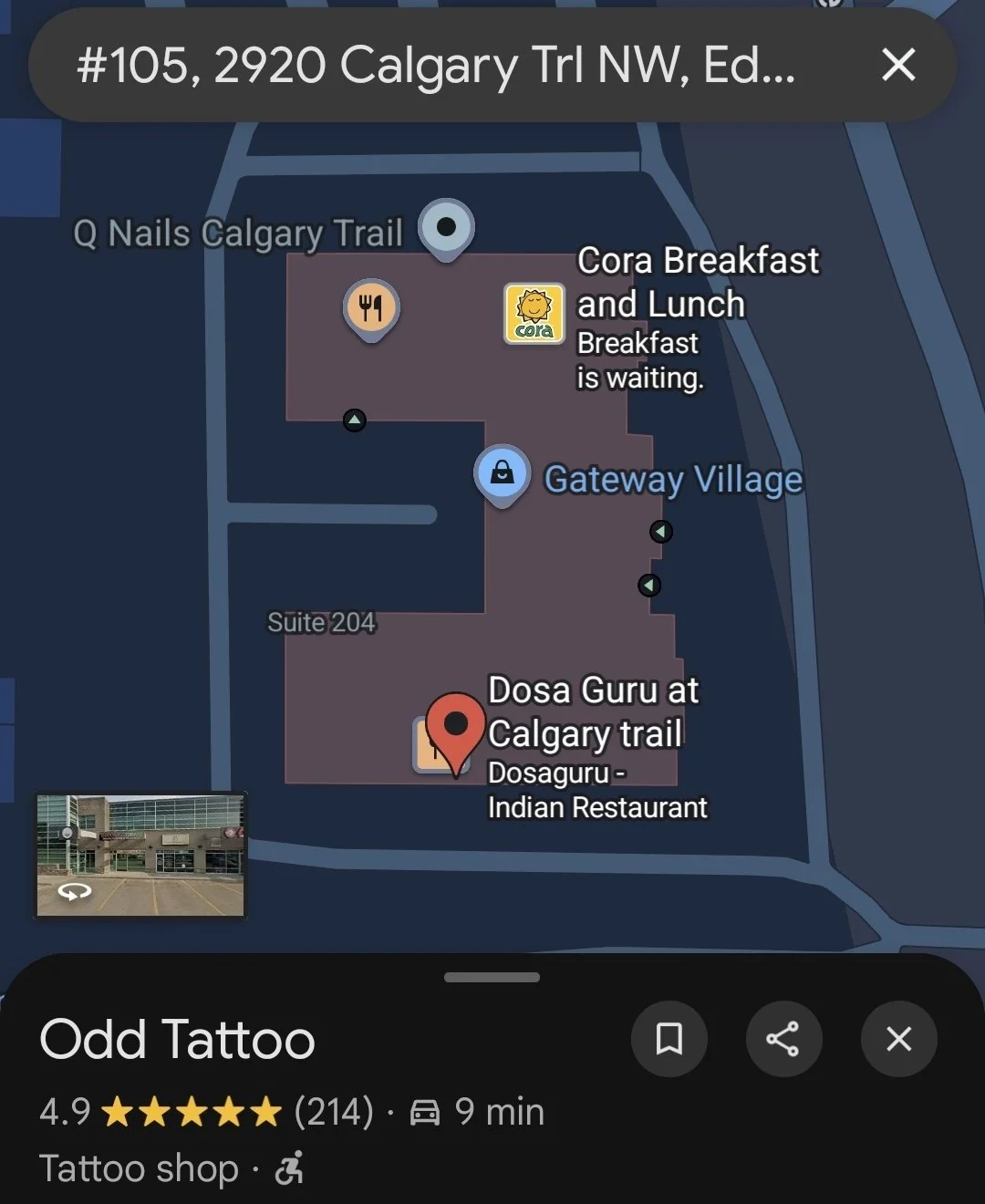 ODD Tattoo Studio is a private, appointment-only tattoo shop in Edmonton located at Suite #105, 2920 Calgary Trail NW. Just minutes from Southgate Mall and South Edmonton Common, our studio is easy to reach by car or transit, with free parking on site.